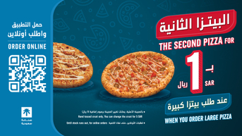 أي 2 بيتزا كبيرة وأكثر بـ SAR 29 للواحدة